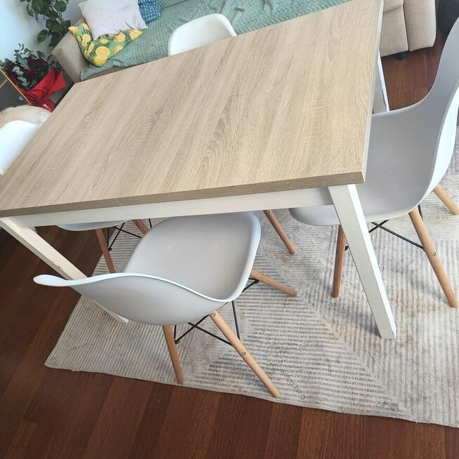 Stół rozkładany z 4 krzesłami, stół nosi na nogach ślady użytkowania. W pełni się rozkłada.
